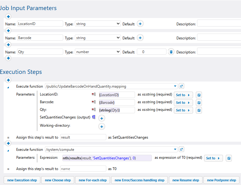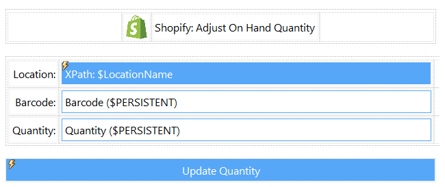 After the location is set, we will configure the next page in the app to ask for a barcode and a quantity that we will pass to the following MapForce mapping. This updates the on-hand quantity of the item corresponding to the barcode.