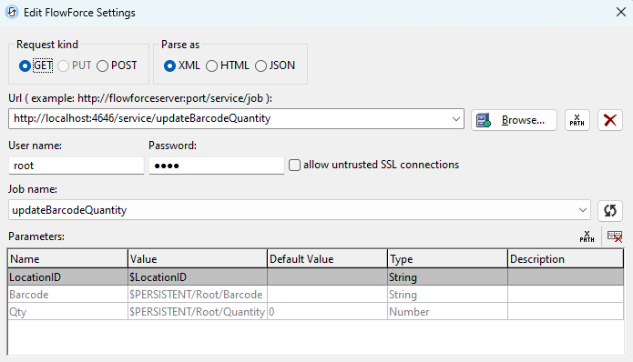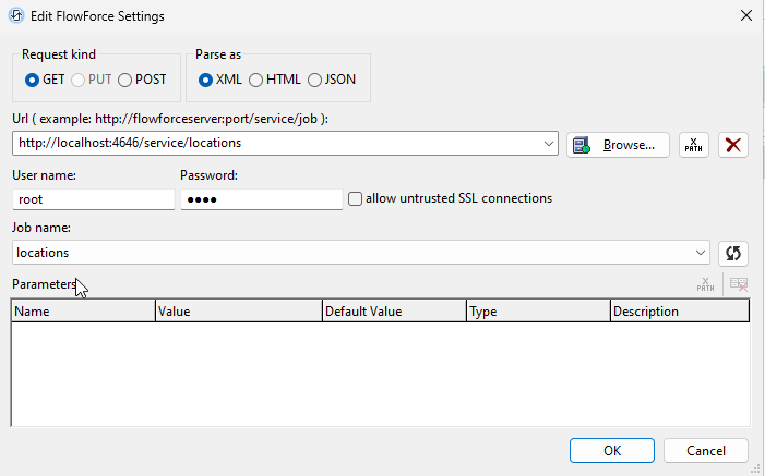 Please note, that URL should point to the FlowForce Server hostname, unless FlowForce Server and MobileTogether Server run on the same machine, in which case localhost will work. Also, while we are simply going to use http: for our example running on a local machine, you should definitely use https: in any production environment for security reasons.