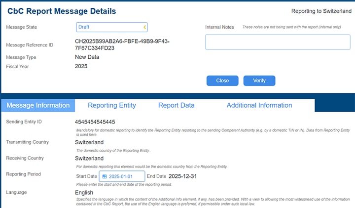 As you work, separate tabs for entering Message Information, Reporting Entity, Report Data, and Additional Information allow for quick navigation and understanding. Prefilled options and data-entry helpers are provided wherever possible.