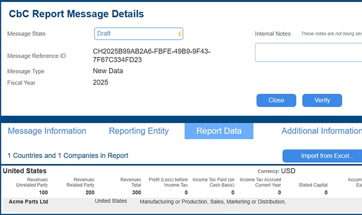 As noted above, companies or tax preparers also have the option to prepare report data in an Excel file – which is likely where they already have this data – using the CbC Reporting Excel template. Click Download Excel Template for Import... to get started.