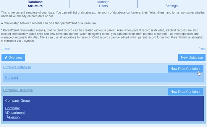 All configurations are done via a straightforward visual interface, and, unlike a classical database system, the admin can even change the hierarchy of containers. What’s more: fields, forms, and even the database structure can be added, changed, or deleted at any time by the administrator – even if records already exist in the database.