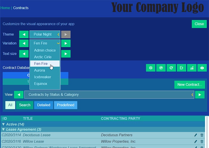 Maybe it’s a stretch to put “fun” and contract management in the same sentence – but you can switch up the appearance of your ContractManager interface to match your mood. Both administrators and end users have the option to choose from a variety of included display themes to customize the look of the Altova ContractManager interface.