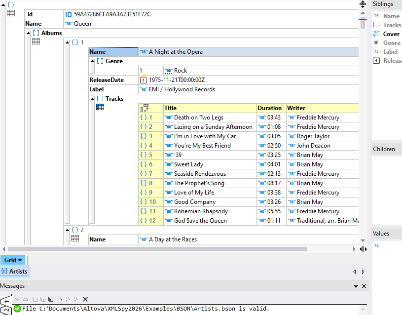 XMLSpy includes a visual BSON editor that displays the structure of the binary document in a grid format so you can immediately understand it and modify it as necessary.