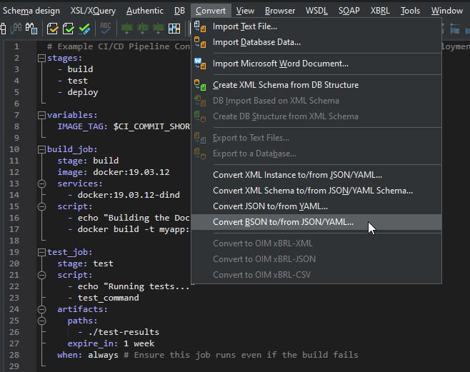 Common use cases include converting JSON or YAML data to BSON for MongoDB, or, conversely, transforming BSON to read or debug it in a more human-readable format. Support in XMLSpy includes: