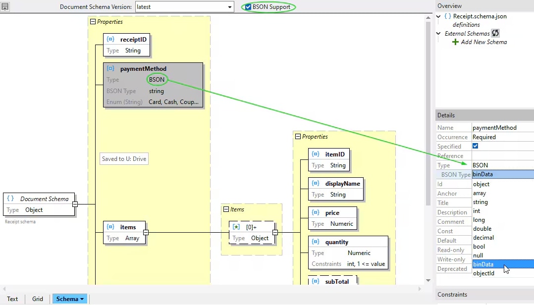 If you don’t have a JSON Schema or need to edit an existing document, the graphical XML Schema editor in XMLSpy includes built-in support for assigning BSON datatypes for JSON objects, properties, and arrays.