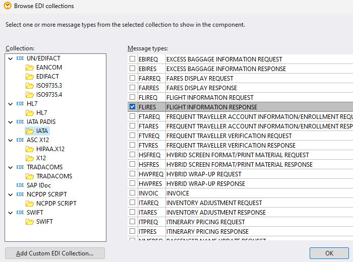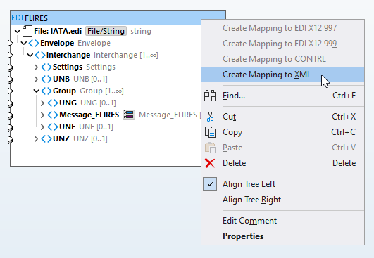 To automatically convert EDI to XML in MapForce, start by dropping any EDI collection into a new mapping. For our example, we'll convert the sample IATA EDI source file included with the MapForce examples to XML. So we'll select the Flight Information Response message from the IATA collection to get started.