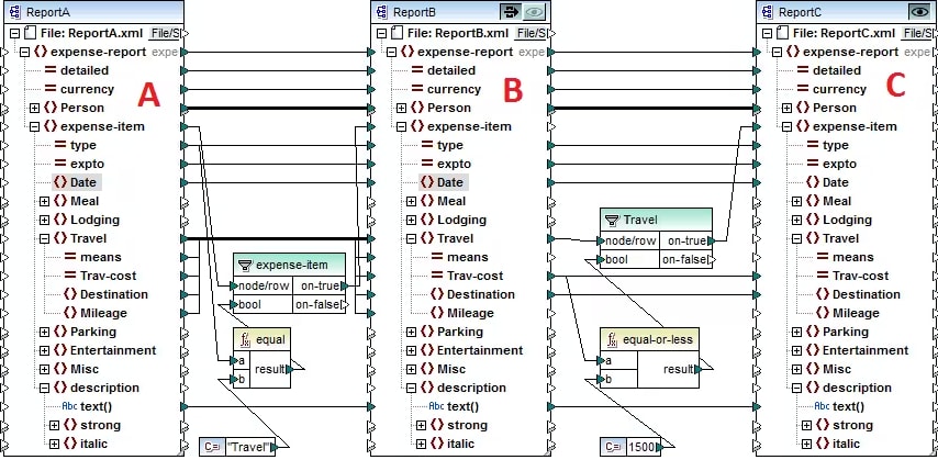 In a multi-step data mapping, at least one component acts both as a source and a target. This intermediate component (labeled B above) creates output that is then used as input for further processing in the next step in the chain. Chained steps in MapForce include the “pass-through” feature, which allows you to preview the output produced at each stage of the mapping for quick troubleshooting. For example, in the mapping above, you can preview (and save) the output resulting from transformation A to B, as well as the output resulting from B to C.