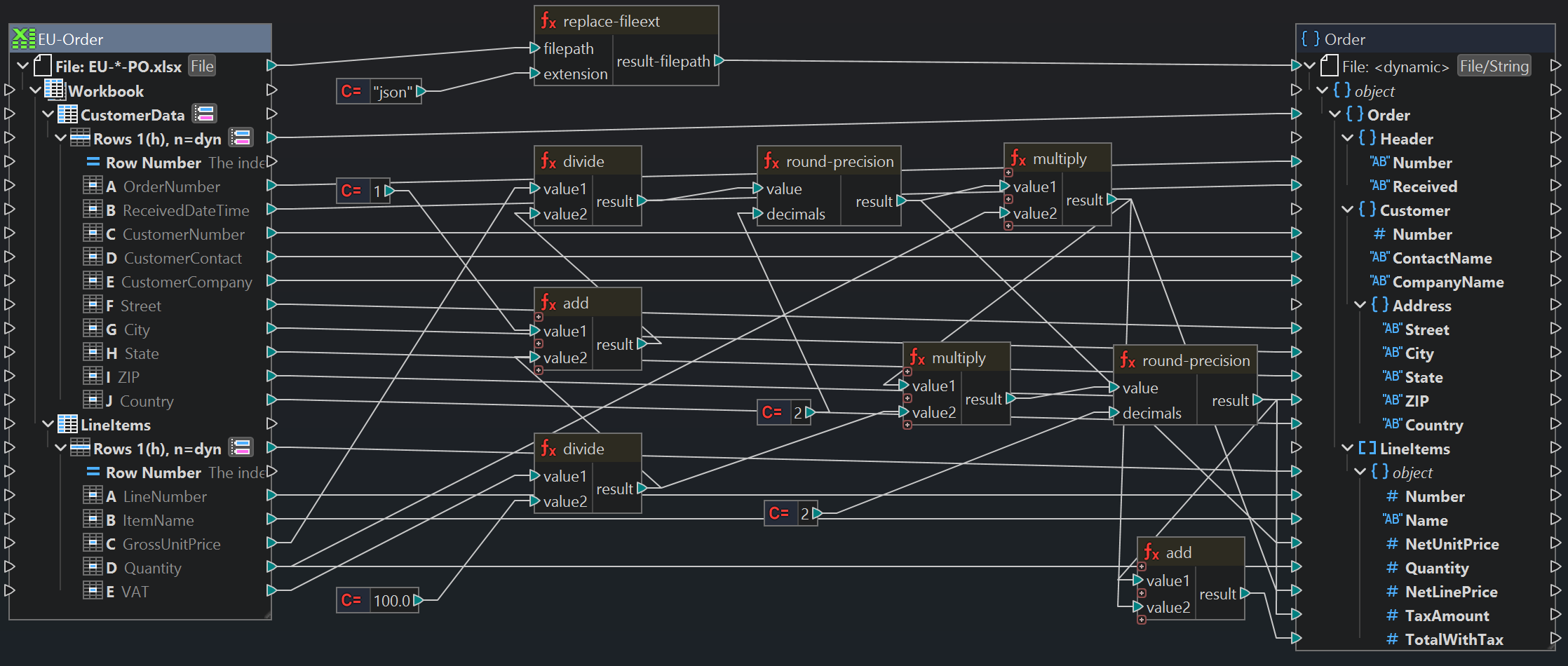In the video, we demonstrate a practical data integration scenario that many organizations will recognize. A company receives purchase orders from both US and EU customers as Excel files. Because tax calculations differ between the two regions, incoming orders need to be routed to the correct mapping, processed with the appropriate business logic, and transformed into JSON output — all automatically.