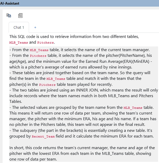 The AI Chat Dialog allows you to send prompts to ChatGPT for a natural language SQL interface that can create SQL statements, generate sample data for a given table structure, create relations between tables, and so on. Once you send a request and receive the response, you can copy and paste the returned SQL into an existing file or create a new SQL file with the response.