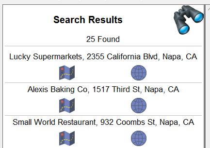 A new Search Results page is opened to deliver information to the user in the form of a scrollable table. Note that the API automatically sorted the results by radius from the current location.