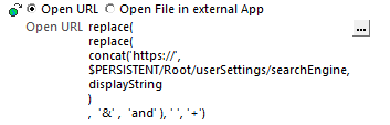 A MobileTogether Open URL action is assigned to the Globe tool to open the name and address of the result location in a Web Browser window. The nested replace operators ensure generation of a URL with valid syntax.