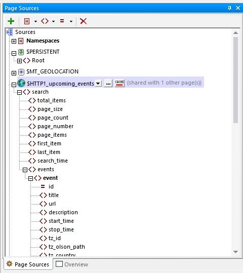 When we open the Sub Page in the MobileTogether Designer, the Page Sources helper window displays the data tree for the Sub Page where data returned by the events API is stored.