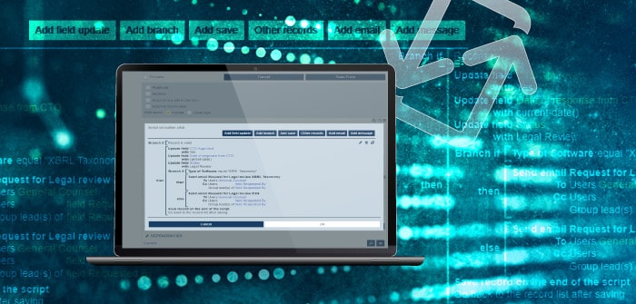 Major scripting extensions: the visual scripting editor lets app administrators define sophisticated app behavior in response to user input (shown below)
