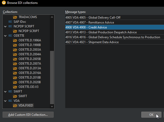 MapForce (version 2023r2 and higher) supports the most commonly used VDA EDI transactions: