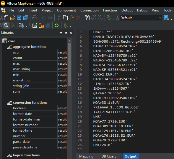 After you define the mapping, you can click the Output tab to view the transformed data, which in this case is an EDIFACT message.