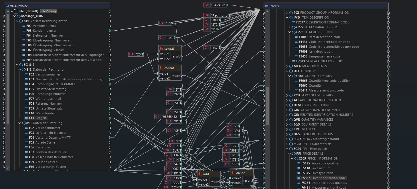 This makes it easy to drag and drop to associate fields between the source and target component(s). A comprehensive library of data processing filters and functions is available for transforming source data as needed to suit the target data format. In the mapping below, a VDA EDI message is mapped to the EDIFACT Invoice message, with constants and functions transforming the data as required to conform to the target data structure.
