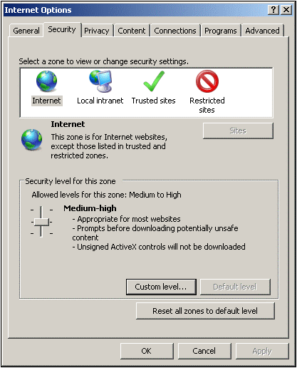 2.Wählen Sie das Register "Sicherheit" (siehe Abbildung oben) und anschließend die Zone, für die Sie die Einstellung vornehmen möchten (Internet oder lokales Intranet).