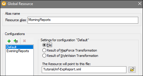The settings Result of MapForce Transformation and Result of StyleVision Transformation are discussed in Transformation Results as Global Resources.