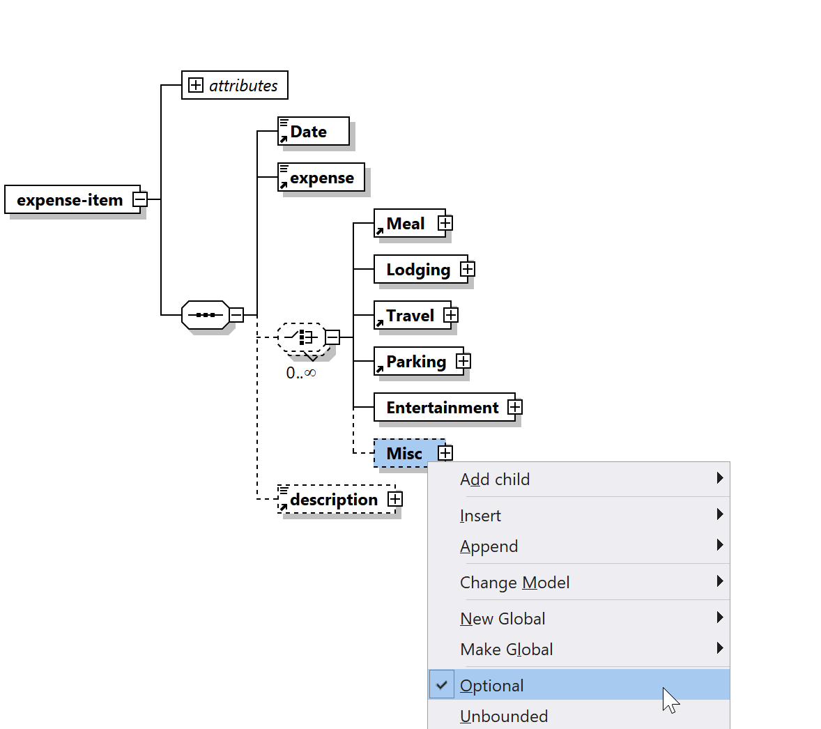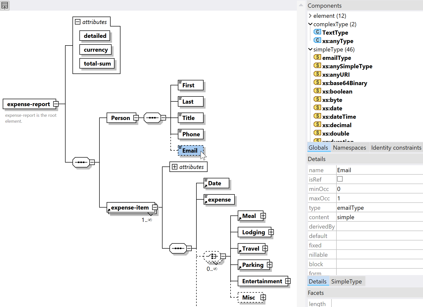 Elements appear as boxes, their relationships as connectors, and constraints as visual annotations. You can see at a glance whether an element contains child elements, what attributes have which data types, and whether elements are optional or required. The visual representation makes the schema structure and hierarchy immediately clear.