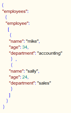 • The JSON data in this example consists of a map with a key named employees. The value associated with the employees key is a nested map consisting of a key named employee.