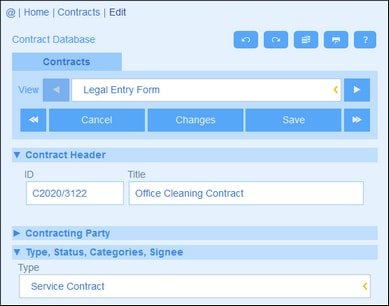 The screenshot below shows the first three sections of a data-entry form, where all sections are on the same page. The first three section names are: (i) Contract Header, (ii) Contracting Party, (iii) Type, Status, Categories, Signee. When the form is initially displayed, the first and third sections are open, while the second is closed. To open/close a section, click the arrow to the left of its name.