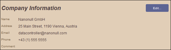 The Company Information item contains information about the entity (company, organization, person, etc) that is collecting or processing the personal data that you want to place under GDPR compliance. Note that companies can be data collectors in some processing activities and data processors in others.
