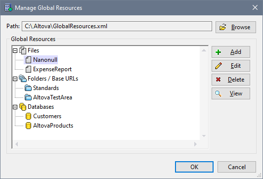 Note: The Altova Global Resources dialog can also be accessed via the Global Resources toolbar (Tools | Customize | Toolbars | Global Resources).