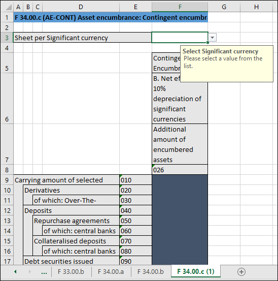 As a general rule, gray cells must not be edited. Only cells that are included in the XBRL-bound area (delimited by the table boundaries) are to be edited. For information about various cells and data to be entered, consult the cell information (properties) displayed in the Cell tab of the EBA Filing Pane.