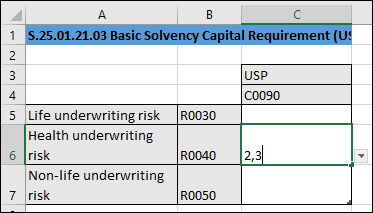 Depending on the XBRL taxonomy, some reports might have facts that represent a list of comma-separated multiple values. As a result, the corresponding cell also requires multiple values to be entered in the same cell. To enter data for such cells, expand the drop-down list and click all the relevant items. Alternatively, you can type all the numeric values, separated by a comma (see screenshot below). Remember that you can view all possible values of a cell in the Cell tab of the EBA Filing Pane.