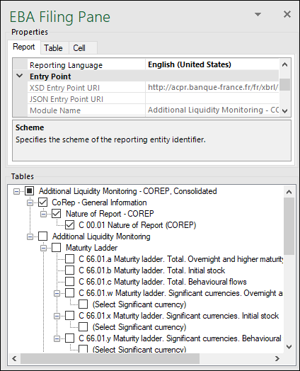 The EBA Filing Pane (screenshot below) enables you to include and exclude tables from the report, view information about each cell, view and set various report properties. By default, this pane is visible. You can show or hide it by clicking the Toggle EBA Filing Pane command on the ribbon. The EBA Filing Pane has two sections: Properties and Tables (see subsections below).