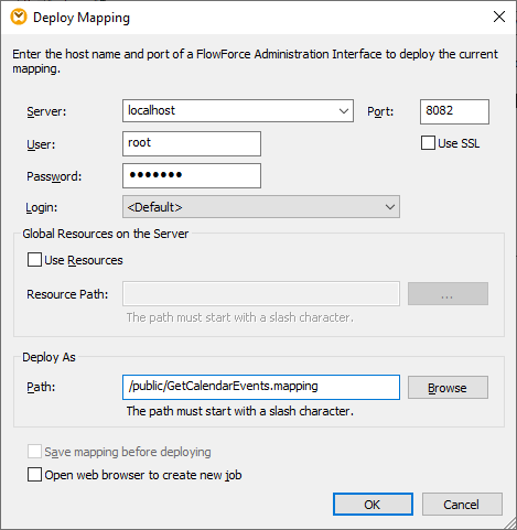 4.You must have a FlowForce Server user account and write access to one of the FlowForce Server containers. To keep things simple, this example uses the default FlowForce Server root account and deploys the mapping to the default public container; these details are otherwise configurable.