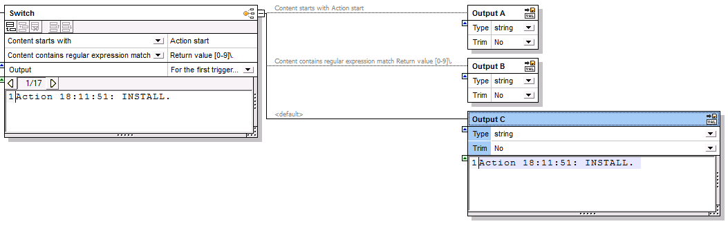 1.Redirect the current row to output A if it contains the value "Action started". You can find such rows by using a condition of type "Content starts with", and enter "Action started" as value.