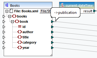 To help you in the mapping process, MapForce highlights mandatory inputs in orange in target components. The example below shows that as soon as you connect the book element of the Books component to the publication element of the BookOutput component, the connectors of the mandatory nodes of the BooksOutput component will be highlighted. If you do not connect mandatory inputs, the respective nodes will not be mapped to the target, and the mapping will be invalid.
