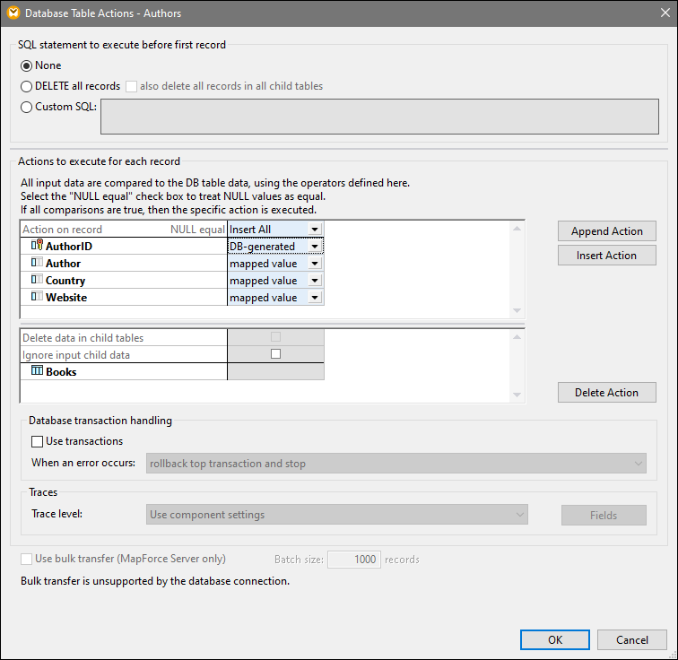 The Use bulk transfer option means that multiple INSERT statements are executed as one query. Using this option dramatically speeds up the Insert process, because only one statement needs to be executed instead of many. The Use bulk transfer option is configured in MapForce, but the actual bulk transfer of data occurs when the mapping is run by MapForce Server.