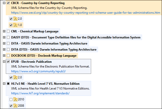 Installed schemas. These are shown in the GUI with their check boxes selected (in the screenshot below the checked and blue versions of the EPUB and HL7v3 NE schemas are installed schemas). If all the versions of a schema are selected, then the selection mark is a tick. If at least one version is unselected, then the selection mark is a solid colored square. You can deselect an installed schema to uninstall it; (in the screenshot below, the DocBook DTD is installed and has been deselected, thereby preparing it for de-installation).