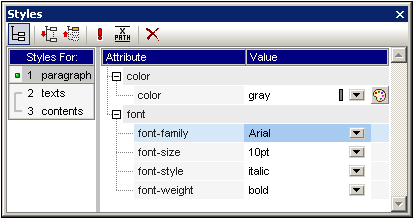 •The left-hand-side, Styles-For column, in which the selected component types are listed. You should note that when a selection is made in Design View, it could contain several components. The selected components are listed in the Styles-For column, organized by component type. One of these component types may be selected at a time for styling. If there is only one instance of the component type, then that one instance is selected for styling. If there are several instances of the component type, then all the selected instances can be styled together. The defined styles are applied locally to each instance. If you wish to style only one specific instance, then select that specific component instance in Design View and style it locally in the Styles sidebar. You can also select a component range by selecting the start-of-range and then the end-of-range component with the Shift-key pressed. For detailed information about the selection of component types, see Defining CSS Styles Locally.