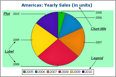 •General: The chart title (see screenshot below) is the same as the basic setting (see above) and can be edited as an advanced setting also. Other settings in this dialog are the background color of the chart and the plot. In the screenshot below, the plot has been given a pale green background color. An image file can also be set as the background image of the chart and/or the plot. This image can be stretched to cover the entire area of the chart or plot; zoomed to fit so that the zoom matches one of the two dimensions (of chart/plot); centered; or tiled. The legend is the key to the color codes in the chart, and it can be turned on or off.