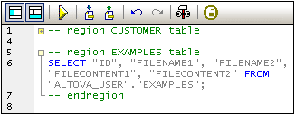 Regions are sections in SQL scripts that are marked and declared to be a unit. Regions can be collapsed and expanded to hide or display parts of the script. It is also possible to nest regions within other regions. Regions are delimited by --region and --endregion comments, respectively, before and after the region. Regions can optionally be given a name, which is entered after the --region delimiter (see screenshot below).