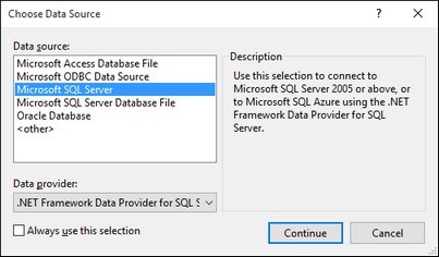 2.Select a data source from the list (in this example, Microsoft SQL Server). The Data Provider is filled automatically based on your choice.