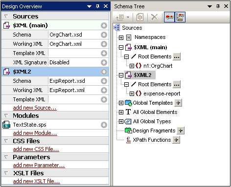 In order to combine the dynamic XML data from different documents, you first add to the SPS the different schemas that are involved. You do this in the Design Overview sidebar (screenshot below). This creates a tree for each schema in the Schema Tree sidebar (screenshot below). You can choose the Working XML File, Template XML File, and Root elements for each added schema (see screenshot below and the topic Design Overview sidebar). The global elements in all the added schemas are listed in the All Global Elements tree of the Schema Tree sidebar, and are available for creation as global templates.