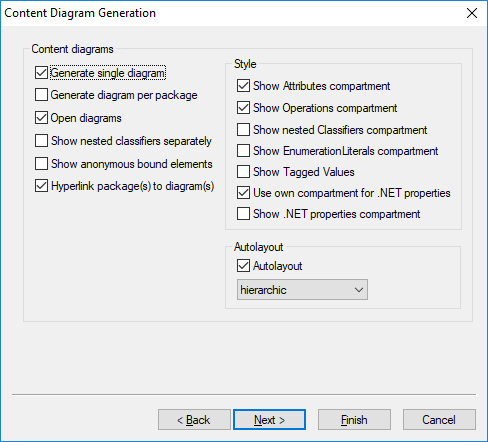 8.Select the diagram generation options as shown below, and click Finish. (These options are applicable to Package diagrams generated automatically on code import.)