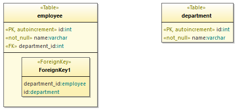 Primary, foreign, and unique keys are classes with the «PrimaryKey», «ForeignKey», «UniqueKey» stereotypes, respectively.