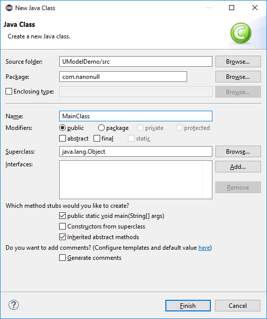 1.If you haven't done that already, create a simple Java project with UModel, as shown in Example: Generate Java Code. This is a very simple example consisting of a Java package with only one class. When you complete the example, the directory C:\UModelDemo\src will contain the required Java source code.