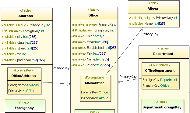 You can import SQL databases into UModel in order to view their structure or modify it using UML (for a list of supported databases, see Database Support). UModel can conveniently display the database structure in UML Database diagrams similar to the one illustrated below.