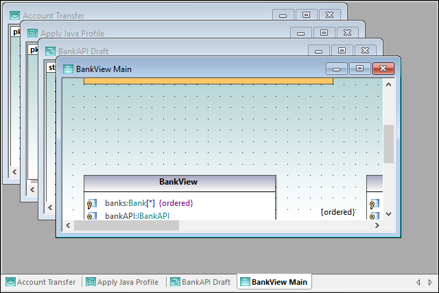 The diagram pane hosts all diagram windows that are currently open. For information about creating new diagrams, opening existing ones, and manipulating elements inside the diagram, see the How to Model... chapter.
