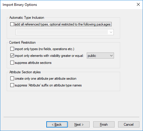 When you run the menu command Project | Import Binary Types, one of the wizard steps prompts you to specify the binary import options. The options you can set are described below. Note that the dialog box options may be slightly different, depending on whether you are importing .NET or Java binaries.