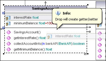 1.Right-click the class title, e.g. SavingsAccount, and select the context menu option Create Getter/Setter Operations. The Create Getters/Setters dialog box opens displaying all attributes available in the currently active class.