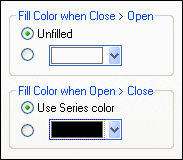 If both opening and closing value are defined as series, you can choose the colors and whether or not the candle should be filled if the closing value is greater than the opening value.