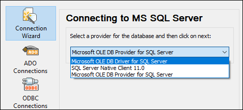 1.Start the database connection wizard, select Connection Wizard and then Microsoft SQL Server (ADO). Click Next.