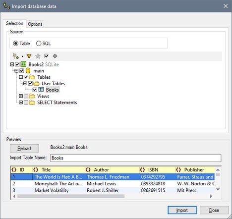 In the Table selection view, you can select the database tables to import by checking the table's check box (see the Table Selection screenshot above). The contents of the table can then be displayed in the Preview pane by clicking the Preview button.